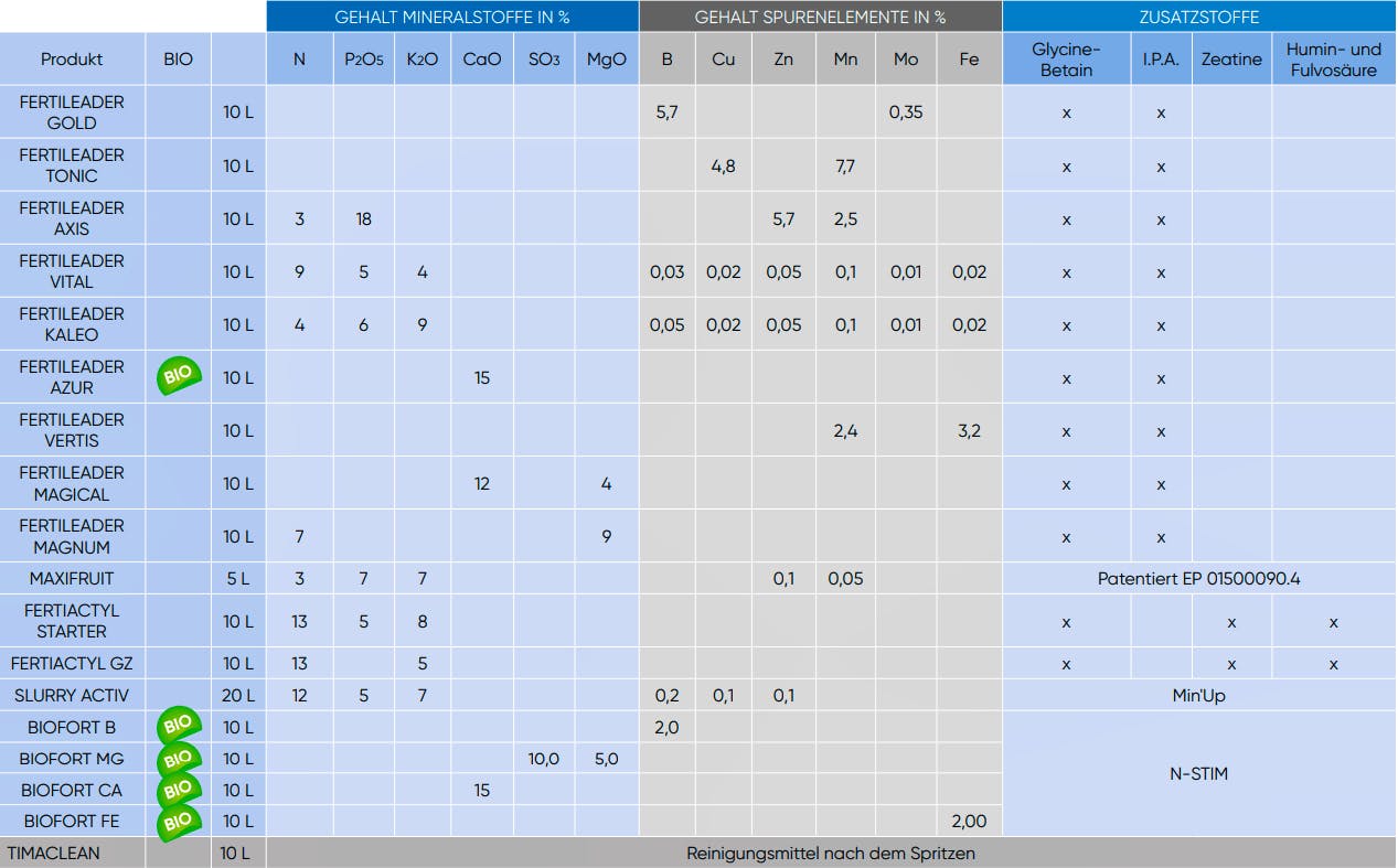 Biokonform, reich an Kalzium. Fertileader Azur basiert auf den Wirkstoff Seactiv. Seactiv ist ein Aktivator für die Zirkulation und Verteilung der Nährstoffe und der Assimilate. Die aktiven Wachstumsorgane werden dabei besonders bevorzugt mit Nährstoffen versorgt, ohne die älteren Pflanzenteile zu benachteiligen (Wirkstoff IPA). Dies führt dazu, dass die Blüten- und Fruchtanlagen besonders gut versorgt werden und somit auch zu mehr Ertrag mit bester Qualität. Die Photosynthese wird gesteigert, wodurch die Pflanze stresstoleranter gegen äussere Einflüsse (Wetter, Pilze, Unkräuter) wird. Dank dem Wirkstoff Glycin-Betain speichert die Pflanze mehr Wasser in den Zellen. Dadurch ist sie besser geschützt vor Frost und Trockenperioden.