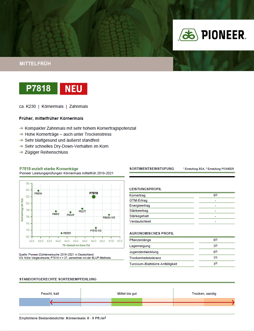 P7515 Bio è una varietà a duplice attitudine, precoce e ad alto rendimento, con un ottimo sviluppo giovanile e un'elevata resa in granella.
